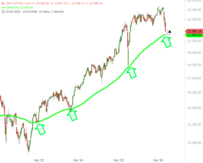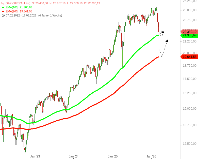 Wenn das Irankrieg-Thema die Märkte aber weiter unter Druck setzt, muss auch mit einem temporären Bruch dieses grünen Auffangnetzes kalkuliert werden. Der EMA200 auf Wochenbasis (rot) liegt bei derzeit 19.641 Punkten als nächstes Auffangnetz im Markt.