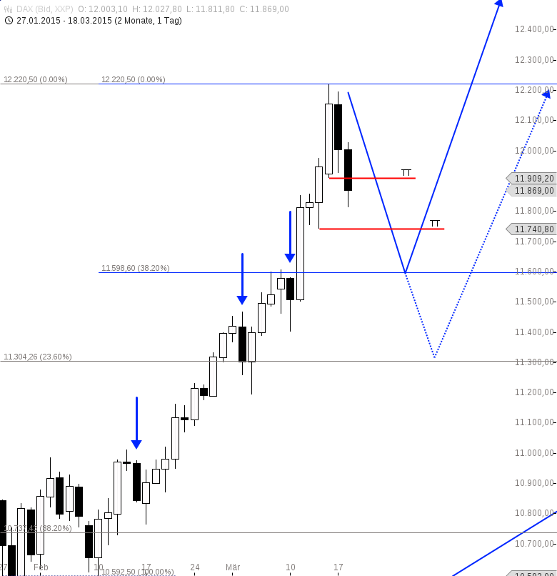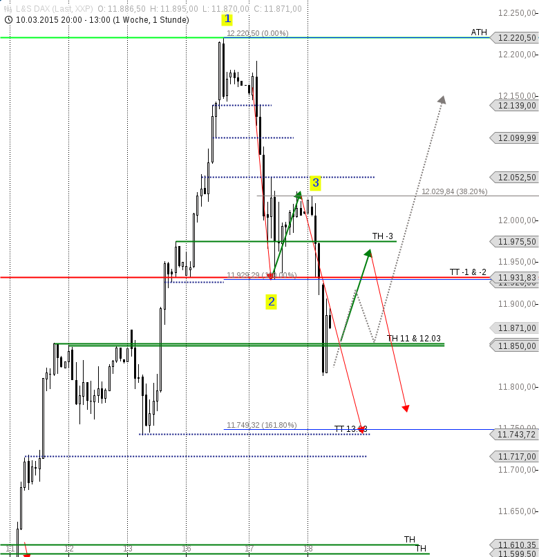 Eine weitere Möglichkeit wäre, wenn der DAX zum Beispiel im Stundenchart nachdem Test der Hochs vom 11.03. und 12.03 ein 1-2-3 Tief ausbilden würde. Ich habe das Szenario grau gepunktet dargestellt.