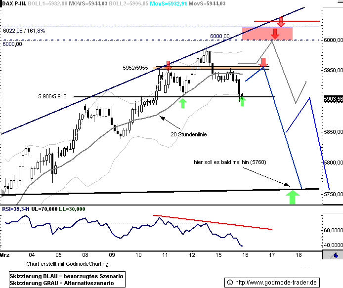 Kaufsignale mit Ziel 6000 treten ein, wenn der DAX über 5956 klettert. Höher als 6.000/6.022 geht es auch heute kaum.