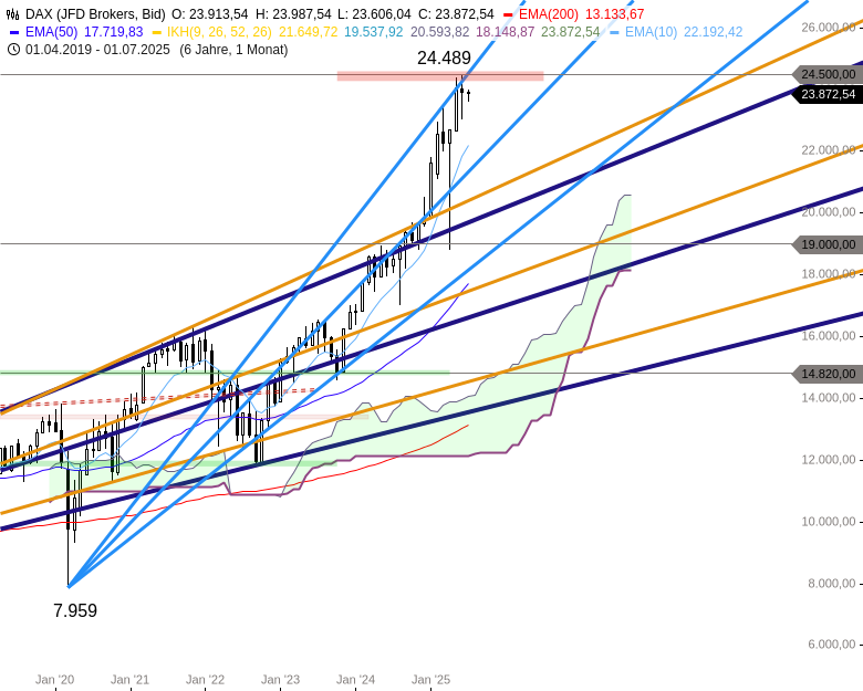 Der DAX befindet sich im Monatschart weiterhin direkt unter seinem obersten Fibonacci-Fächer bei welchem in den Vormonaten immer wieder das jeweilige Monatshoch erreicht wurde. So auch im Vormonat Juni. Im großen Bild hat der DAX also wahrscheinlich nur noch wenig Luft nach oben, die obere Begrenzung verläuft aktuell um etwas 24.500 Punkte. Doch sollten entsprechende Warnsignale auf niedrigeren Zeitebenen abgewartet werden. Unter anderem dient dazu der 10er-EMA im Tageschart, der aktuell bei 23.780 Punkten ungefähr notiert.