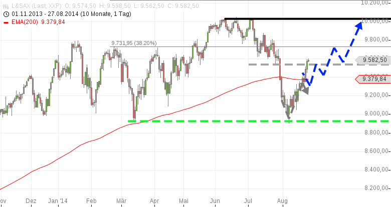Der DAX steht unterhalb des 61,8% Fibonacci Retracement des Abwärtsimpulses des Monats Juli. Das Retracement liegt bei 9.600 Punkten als Widerstand im Markt. Hier ist zunächst ein Abprallen nach unten, eine Konsolidierung durchaus denkbar. Ein solcher eingestreuter Rücklauf ist nicht gleichzusetzen mit einem Ende der Aufwärtsbewegung. Bei 9.730 Punkten wartet das nächste Etappen-Ziel.