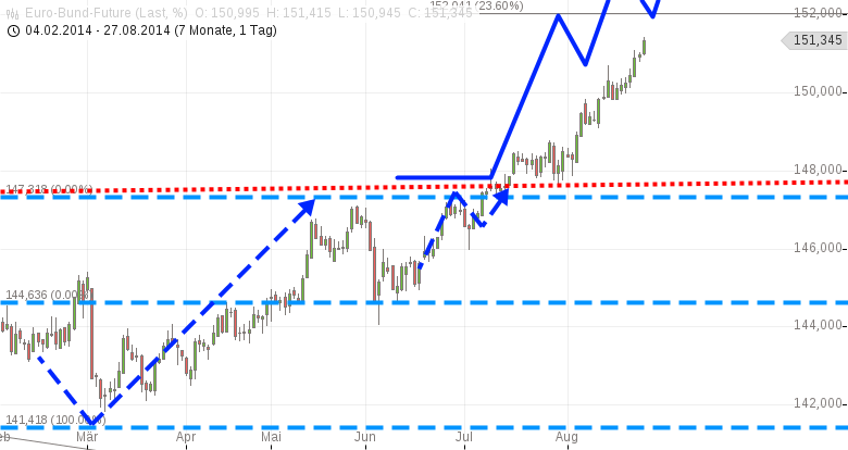 Heute wieder stark, der Bund Future. Intraday aktuell ein Plus von rund 0,4%. Das ist für einen Rentenfuture statistisch gesehen "viel". Das nächste Etappen-Ziel liegt bei 152,xx%. S. blauer Prognosepfeil.