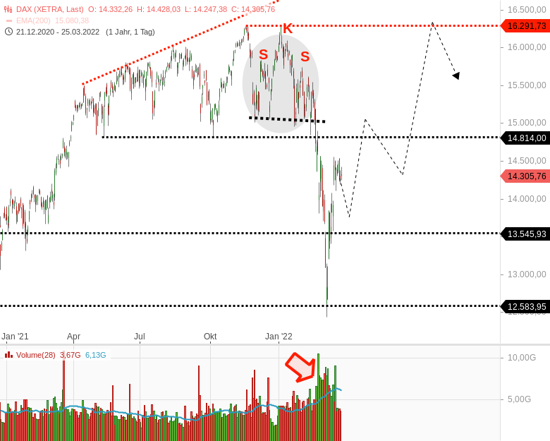 Aufgrund der starken Aufwärtsimpulsität wird rein charttechnisch eine deutliche Kurserholung mit Zielmarken bei 14.800, 15.000 und 16.290 Punkten möglich. Allerdings arbeite ich in der Skizze nur mit einem dünnen grauen Prognosepfeil. Wenn sich die Signallage konkretisiert und verstärkt, stelle ich wenn möglich auf dick schwarz oder dick blaue Pfeile um.