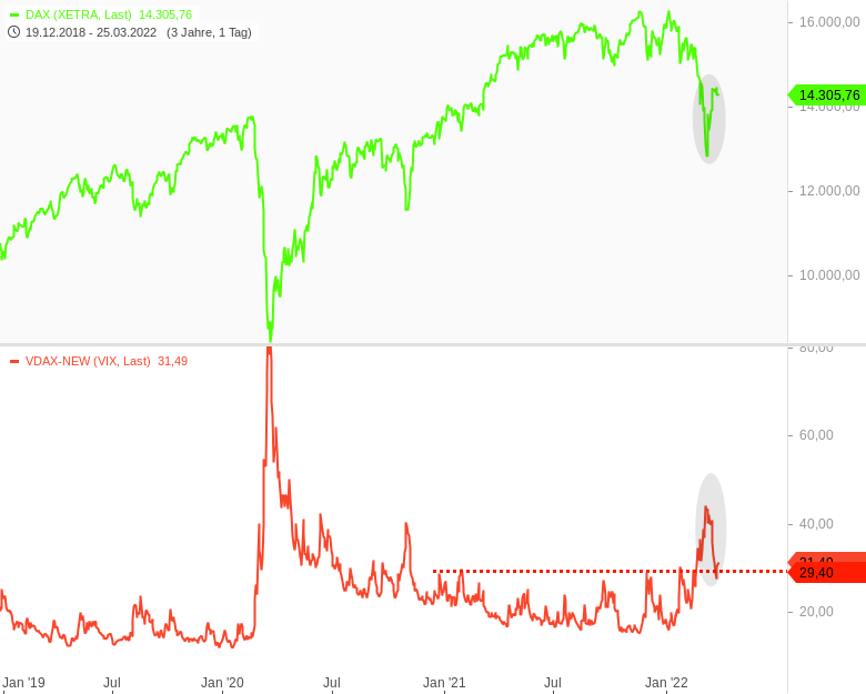 DAX versus VDAX. Der Volatilitätsindex VDAX bewegt sich tendenziell gegenläufig korrelierend (spiegelbildlich) zum Aktienmarkt (im vorliegenden Fall DAX). Der VDAX fällt seit 7. März steil ab, vice versa schnappt der DAX dynamisch nach oben. Das sieht nach einem Ende des VDAX-Spikes aus.