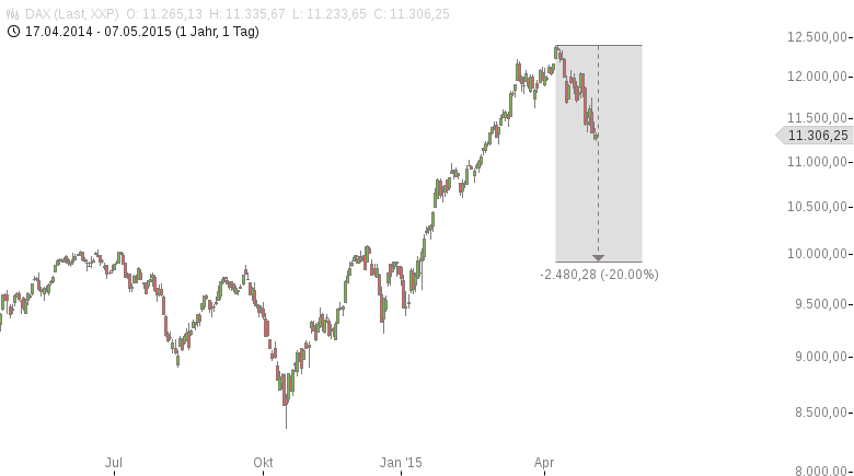 Ich habe am 21. April unter anderem hier gesagt, dass ich eine mehrmonatige Pause in der DAX-Rally erwarte und dass es zu einer Korrektur kommen könnte. Daran halte ich fest. Die laufende Konsolidierung kann sich zu einer 20%-Korrektur ausweiten, was ausgehend vom Hoch bei 12.390 Punkten einen Rückgang bis 10.000 Punkte bringen würde. Ich behaupte das nicht, ich stelle das nur als Hypothese hin.