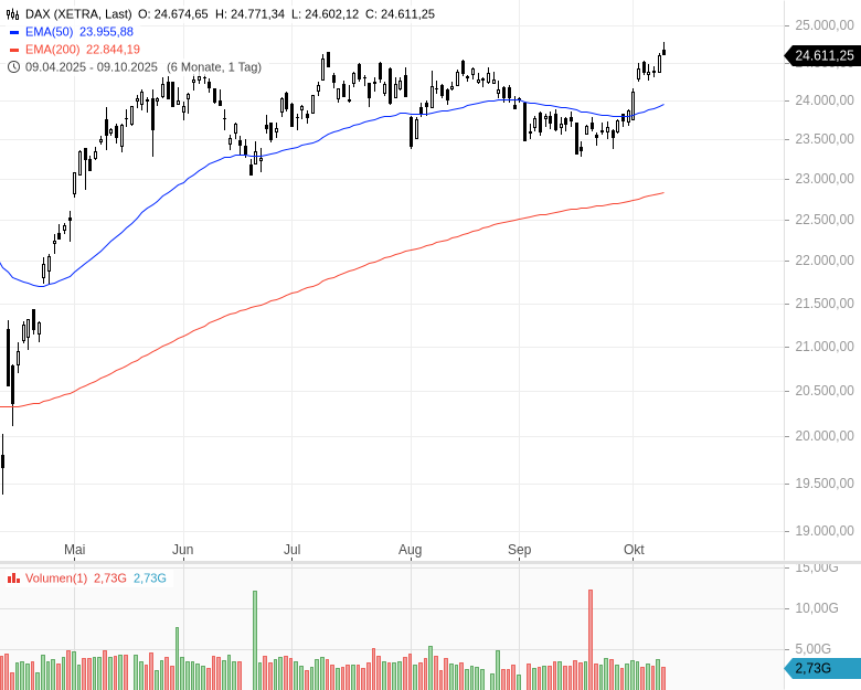 Bereits zum Handelsstart überschritt der DAX am Donnerstag seine bisherige Bestmarke aus dem Juli und stieg im weiteren Verlauf bis auf 24.771,34 Punkte. Im Verlauf gab der DAX seine Gewinne fast vollständig wieder ab und ging nur knapp im Plus mit 24.611,25 Zählern aus dem Handel.