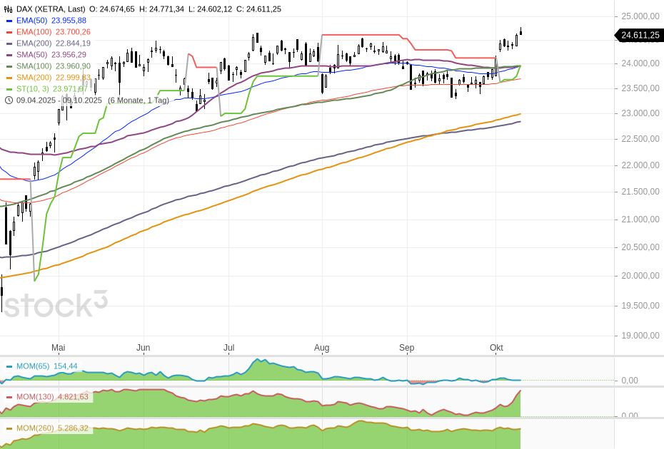 Aus technischer Sicht deuten Trendfolgeindikatoren auf weiter steigende DAX-Notierungen hin. So notiert der DAX über den gleitenden Durchschnittslinien mit Periodenlängen von 50, 100 und 200 Tagen sowie über dem Supertrend und das Kursmomentum auf Sicht von 65, 130 und 260 Handelstagen ist positiv.