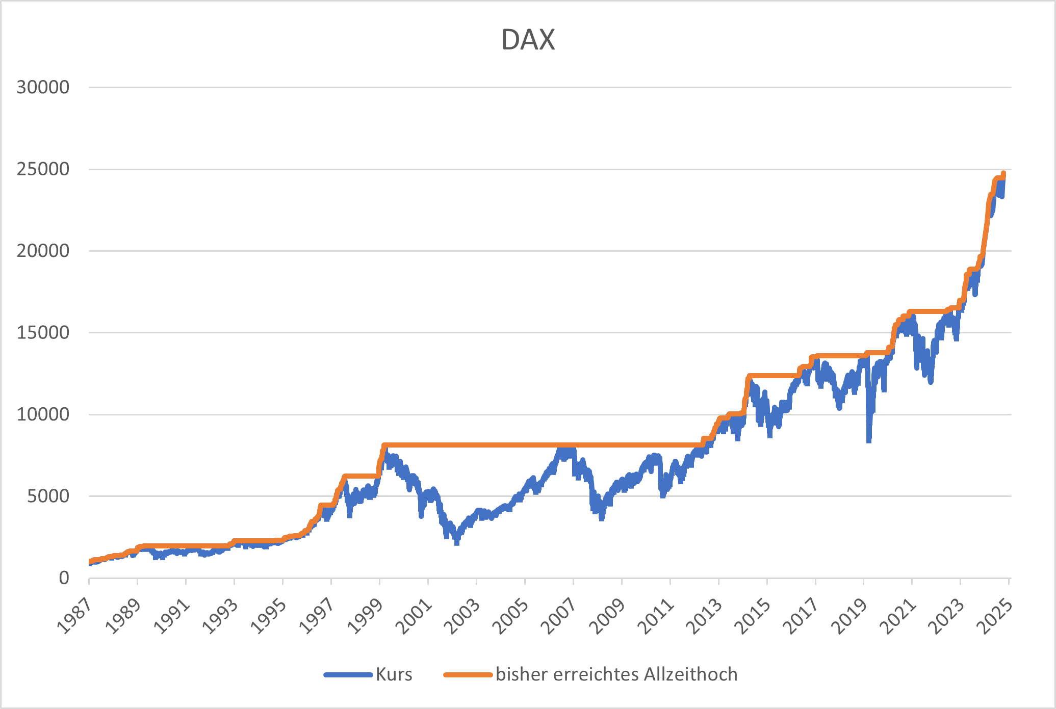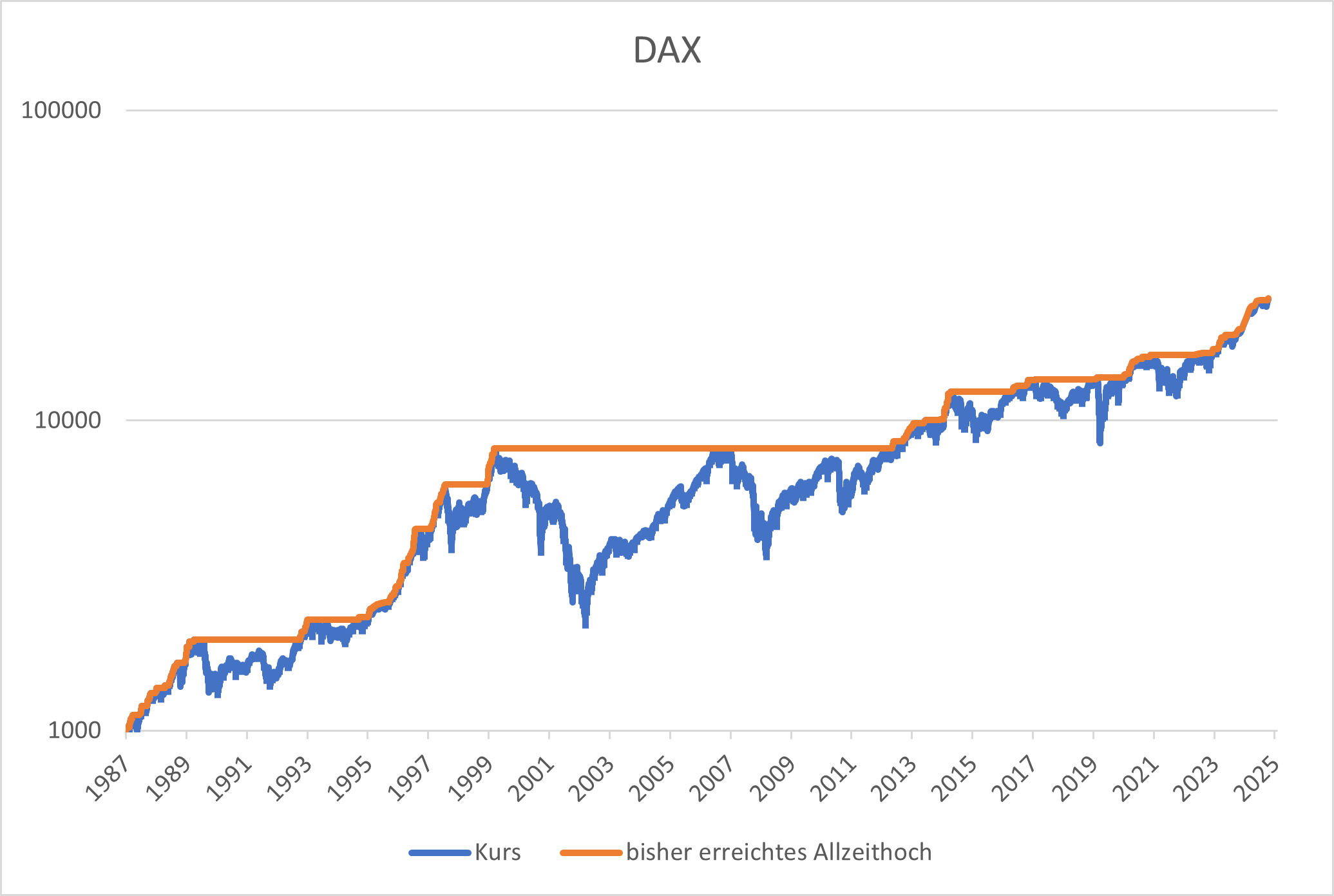 Wie andere Indizes auch zeigt der DAX bei sehr langfristiger Betrachtung einen exponentiellen Anstieg, wobei der Performanceindex (in dem Dividenden rechnerisch reinvestiert werden) auf Sicht der vergangenen Jahrzehnte um rund 8 % pro Jahr zugelegt hat.