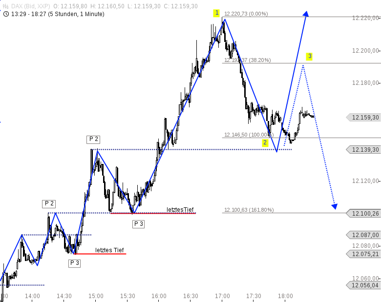 Schauen wir uns den aktuellen Minutenchart vom DAX an. Um 12.100 Punkte sieht man sehr gut, wie ein alter Punkt 2 (P 2) gegen 15 Uhr überschritten wurde um danach genau bis 12100 Punkte zu korrigieren. Das ist ein wirklich perfekter Verlauf im Sinne der Markttechnik.