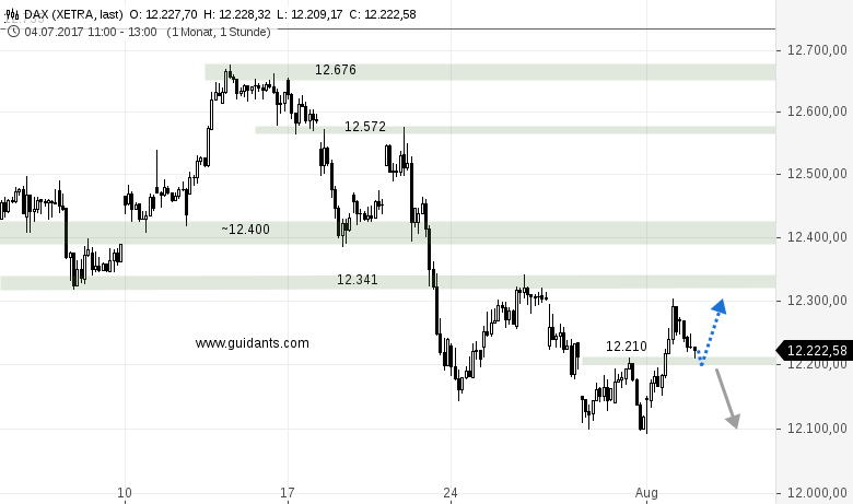 Der DAX korrigiert nach dem gestrigen bullischen Reversal. Eine mögliche Unterstützung hätte der Index um 12.200 Punkte, während auf der Gegenseite ca. 12.250 Punkte nachhaltig überschritten werden müssten. Dies dürfte zum jetzigen Zeitpunkt einem Intraday-Stimmungswechsel gleichkommen, mit der Chance auf neue Hochs.