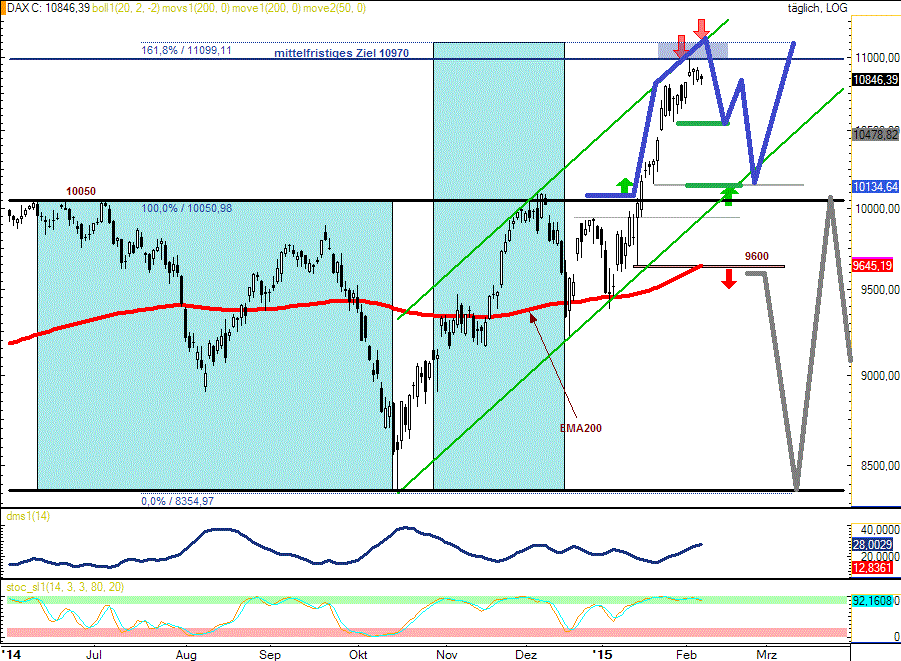 DAX Analyse vom 06.02.2015: Aus meiner DAX Analyse der vorliegenden DAX Chartkonstellation geht hervor, dass aktuell KEIN gutes Umfeld mehr besteht, um den DAX für mehrere Wochen oder gar Monate zu kaufen. Der DAX steht nach Auswertung aller Indizien, unbesehen hier und da noch auftretender temporärer Hochs, vielmehr vor baldigen Rücksetzern bis 10100/10150 und später im Jahr durchaus auch vor nochmaligen Rücksetzern bis 8200/8350.