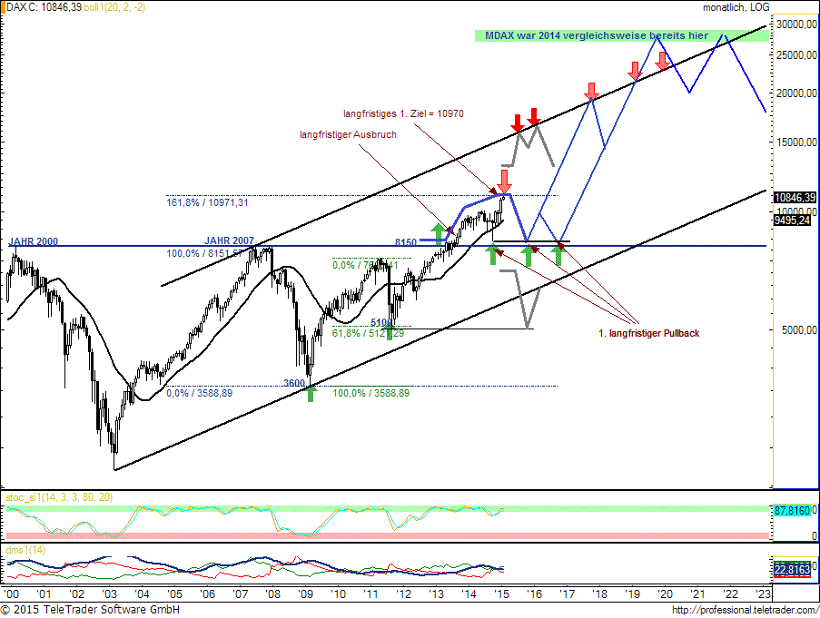 1. Der DAX sollte bedingt durch den Ausbruch über die 10-jährige Horizontalhürde 8150 (vollzogen im Jahr 2013) ein Kursziel bei 10970 erreichen. Das viele Male hier erwähnte Ziel, bspw. in meiner DAX Wochenendanalyse vom 01.10.2013 wurde mit etwas Verspätung am 3. Februar 2015 erreicht (Es sollte eigentlich schon bis Mai 2014 erreicht werden! ABER: Zeitziele sind sekundär, Hauptsache die Richtung stimmt).