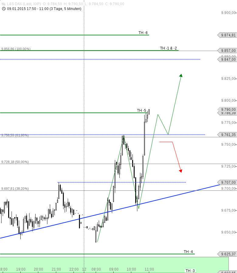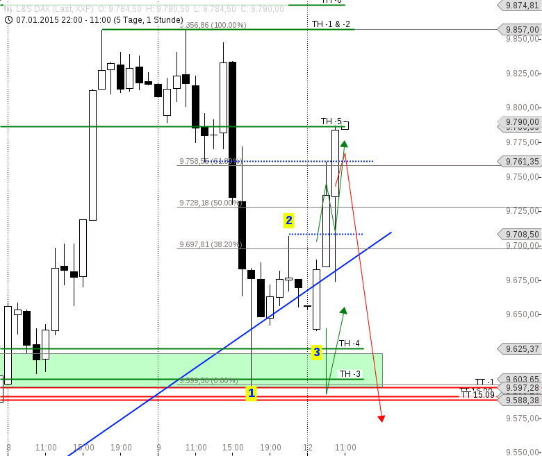 Ich betrachte vorwiegend den 60min Chart und den 5min Chart. Aus dieser Konstellation heraus ergab sich für mich folgendes Muster. Nachdem der DAX am Freitag vollständig die Bewegung vom Donnerstag neutralisiert hatte. War für mich die Frage: "Kommt es heute erneut zu einer Korrektur auf den schwachen Handelstag vom Freitag?". Dazu habe ich mir das Fibonacci-Retracement an die Handelsspanne vom Freitag angelegt um nach oben die Korrekturziele zu ermitteln. Danach schau ich mir vorwiegend horizontale Unterstützungen und Widerstände an. Dabei fiel das abendliche Hoch bei 9707 Punkte ins Auge. Mit einem Überschreiten der 9707 Punkte würde sich im Stundenchart ein 1-2-3 Tief ergeben. Dieses hätte zur Folge, dass der DAX weiter steigen könnte bis 9728 = 50% Korrektur der Abwärtsbewegung vom Freitag und danach die 9758 Punkte. In dieser Nähe lag zudem noch ein lokales Tief vom Freitag gegen 12.40 Uhr. Selbst an der Stelle könnte es im 60min Chart und im Tageschart noch zu einer deutlichen Abwärtsbewegung kommen um die Bewegung vom Freitag nach unten fortzusetzen.