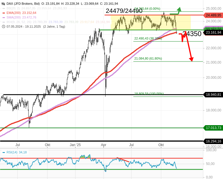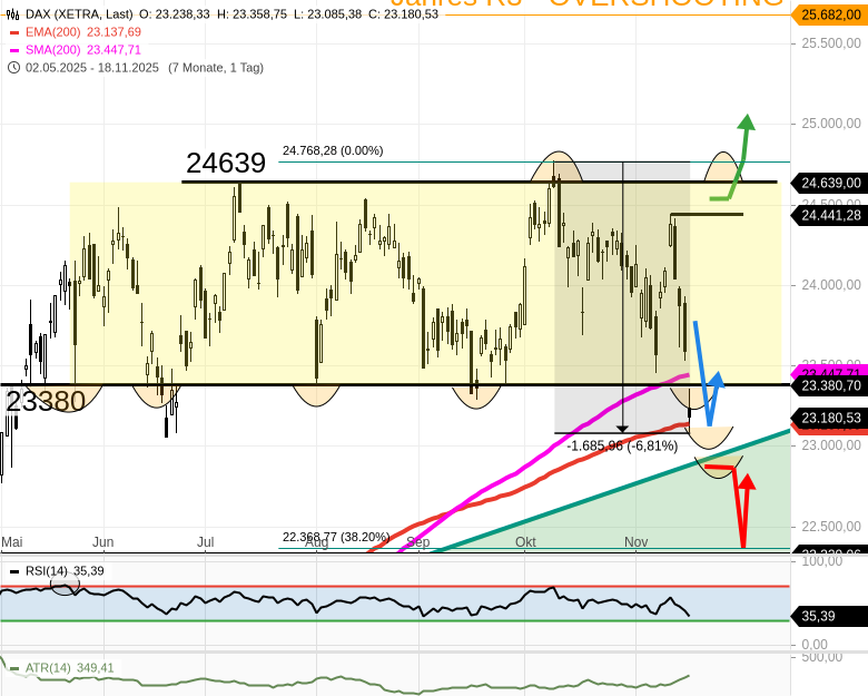 - Im DAX geht es seit DIENSTAG, 18.11., um eine große Richtungsentscheidung in Höhe der wichtigen 200-Tageslinien und um eine wichtige 6-monatige Nackenlinie, deren Unterschreiten ein enormes Abwärtspotenzial freisetzen würde. Es geht konkret um den Bereich 23440/23380/23138. DIENSTAG ging es ergebnislos aus, Tagesschlusskurs 23173.