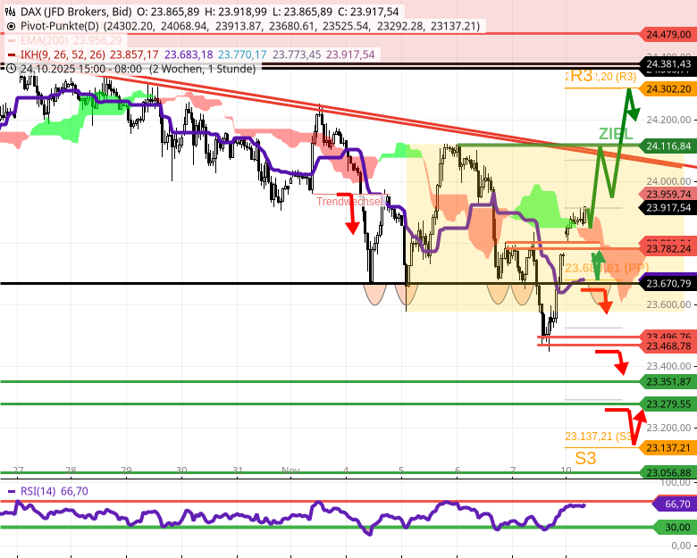 - Die frühen Trader versuchen aktuell wahrscheinlich im indikativen Handel die durchstoßene Wolke als Kaufmarke bei 23850 zu nutzen. Wenn das klappt, wäre es stark. Das Tagesziel könnte dann 24100/24115 sein.