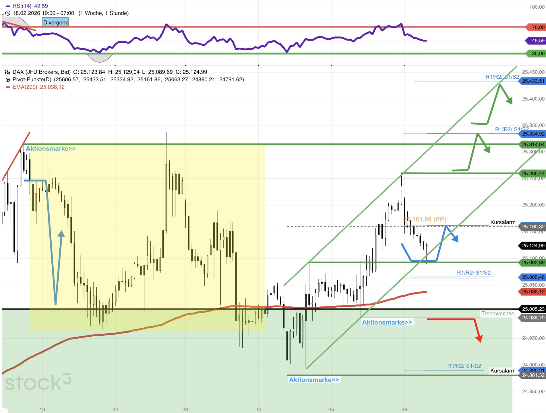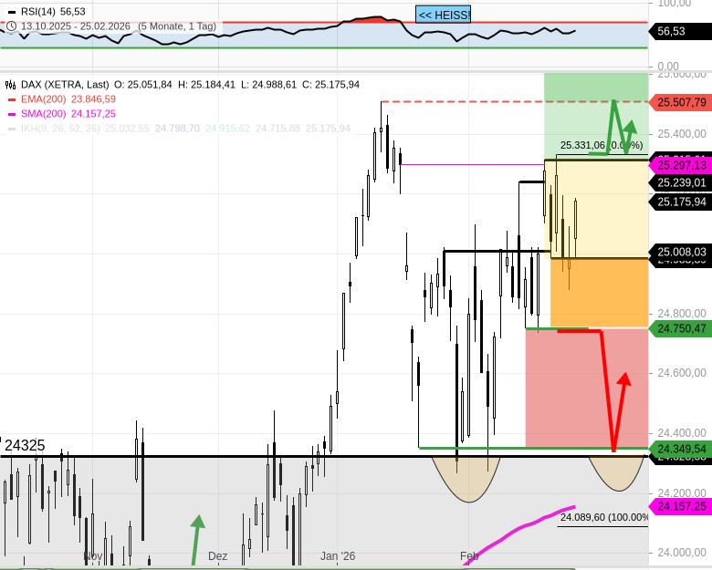 - Auf der Unterseite stützen unterhalb von 25093 auch die DAX Indexmarken 25038 (EMA200/h1) und 25000.