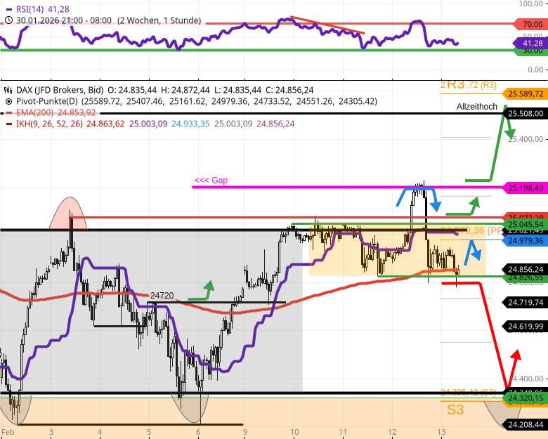 1) 🔴 Fällt der DAX Haupthandel heute per Stundenschlusskurs einer Stundenkerzen auf neue 3-Tages-Tiefs unter 24825, so wäre das als Hinweis zu verstehen, dass sich der DAX Richtung 24325 orientiert.