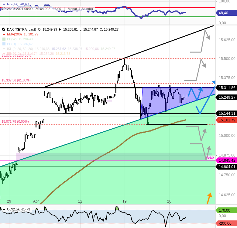 Der DAX schiebt sich heute noch im blauen Dreieck hin und her, welches an er horizontalen Oberseite durch die Horizontale des Hochs 15312 vom 6.4. gebildet wird und im steigenden Teil durch die obere Aufwärtstrendkanalbegrenzung des Kanals der letzten Wochen.