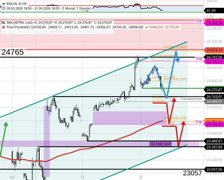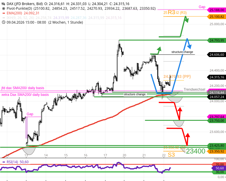 Vor allem sollte der DAX im Tagesverlauf bis 24165/24115/24100 konsolidieren. Alle 3 Marken wurden abends erreicht. - In der Realität stieg der DAX nämlich bis 24600 und fiel dann bis 24020.