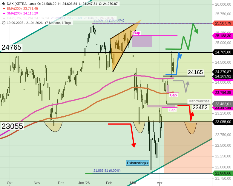 - Der DAX sollte gestern unter dem Aprilhoch verbleiben, allenfalls bis mindestens 24515 steigen und ggf. das Gap von Montag bei 24702 schließen.