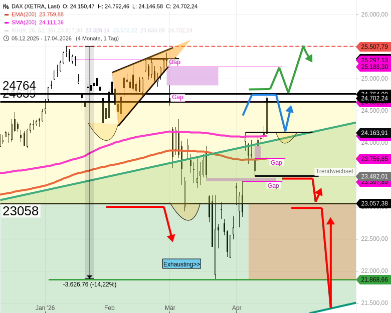 - Der DAX machte Freitag sogar einen Sprung über 24325. Das war wiederum unerwartet. Dabei wurde die erste von 2 alten große Märzkurslücke bei 24638 geschlossen.