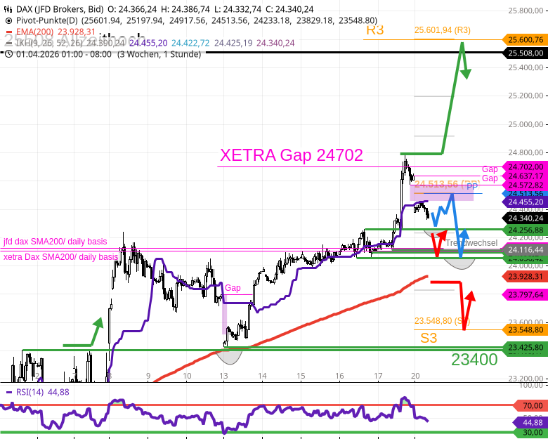- 3) Der DAX hat es auf der anderen Seite mit kleinen intra day Widerständen bei 24455 (Kijun/h1), 24513 (PP) sowie 24600 zu tun.