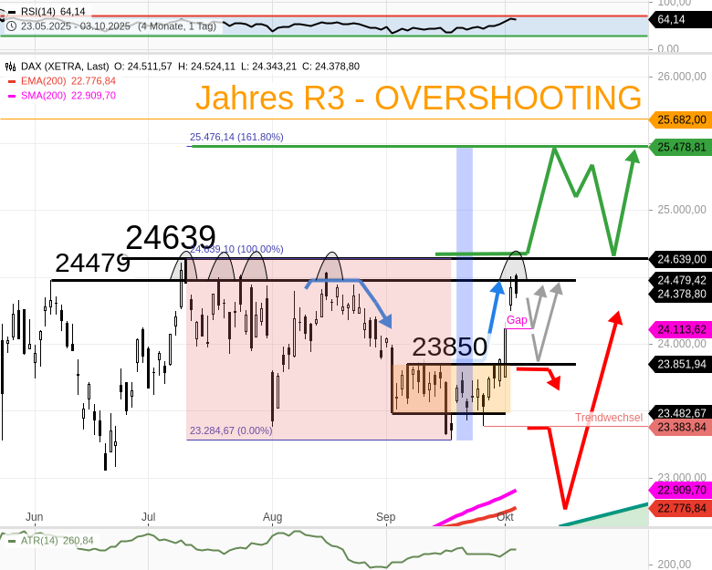 Der bisherige -5,2% Pullback vom Sommerhoch wäre ein neuer Saisonal-Minder-Pullback-Rekord fürs laufende Jahrtausend (so als ob es einen neuen Weitsprungweltrekord für Männer aus dem heiteren Himmel seit 1991 geben würde). Der bisherige Saisonal-Minder-Pullback-Rekord für DAX Drawdowns vom Sommerhoch stammt aus 2005 und umfasste -7,2%. - 🟢 BULLISCH: Steigt der DAX per Tagesschlusskurs über das Allzeithoch 24639, schaltet sich das neue Jahresschlusskursziel 25476 frei.