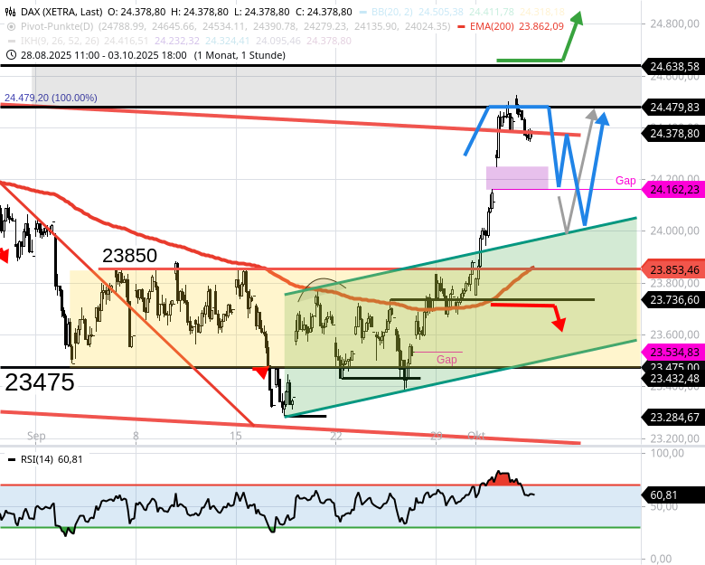 - 🔵 Der DAX pausiert seit 24479 auf natürliche Weise und hat die Chance auf Pullbacks bis 24162/24113 (Gap) oder ~24000. DAX Kurse unter 23975/23850 gibt es hingegen seltener.