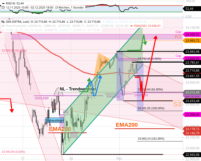 Steigt der DAX per Stundenschluss über 23885, könnten die Marktteilnehmer versuchen, den DAX bis 23984/24040 steigen zu lassen. - 🔴 BÄRISCH: