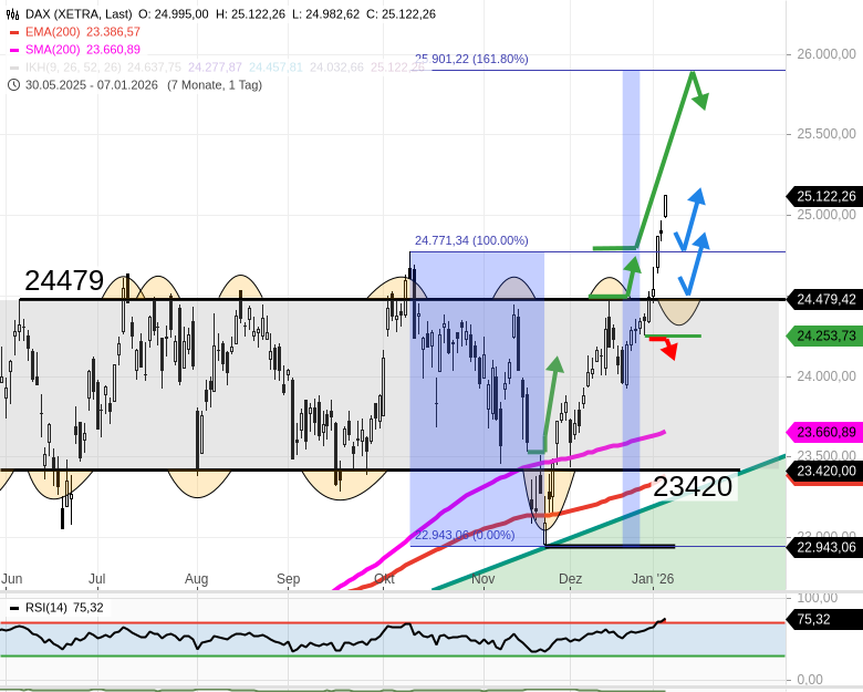 - Der DAX stieg über die große 6-Monats-Hürde 24479 an und entwickelte sich schnell bis 25000+x, zu 25140/25150.
