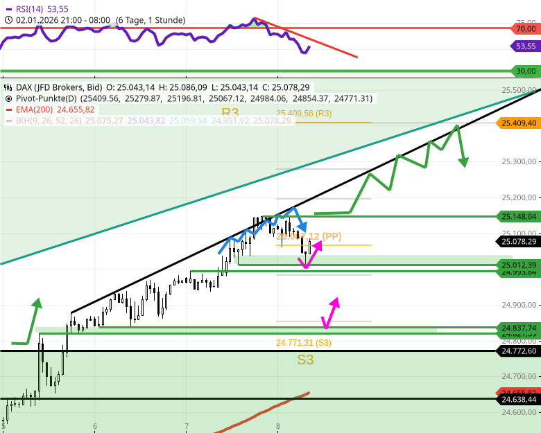 -Steigt der DAX heute erneut, so hat er für heute die Ziele 25150, 25200 (9-10 Uhr wegen Eindämmungslinie schwarz) und 25275/25280 (ca. 22 Uhr wegen Eindämmungslinie schwarz), maximal aber 25409 (wegen Pivot R3 des Tages).