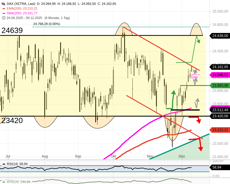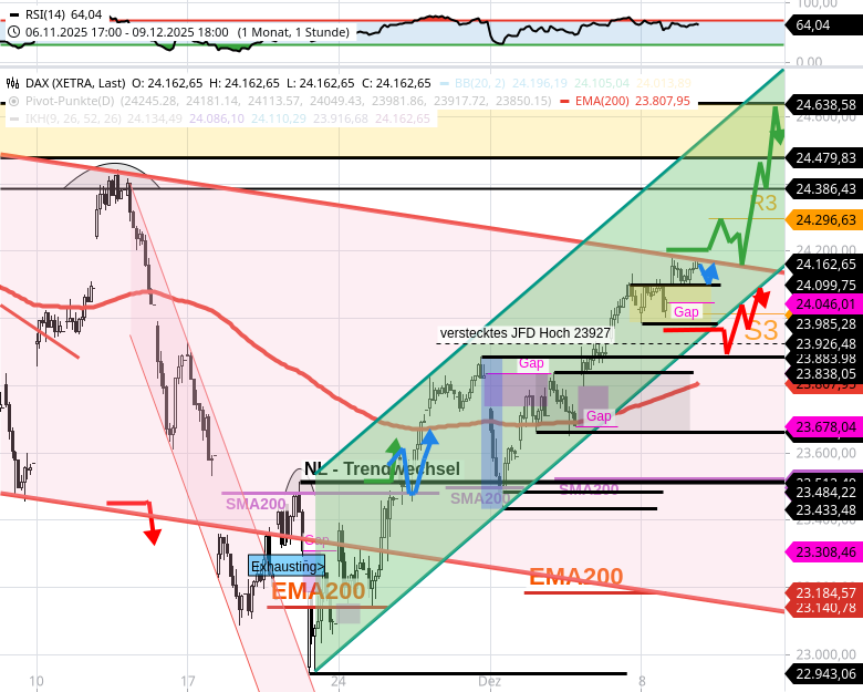 - Stark wäre es, wenn der Handel direkt über 24165/2418 hinwegzieht und die schon ordentliche Ausmaße annehmende Jahresendrally fortsetzt bis zu den letzten großen DAX Hochs bei 24480 und 24640.