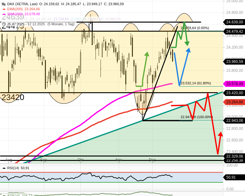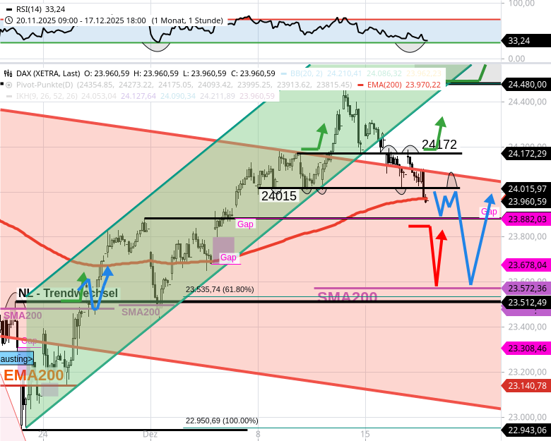 - Der DAX droht direkt weiter zu fallen. Mögliches Ziel ist bei 23580/23420 (SMA200 pink und große Range-Horizontale).