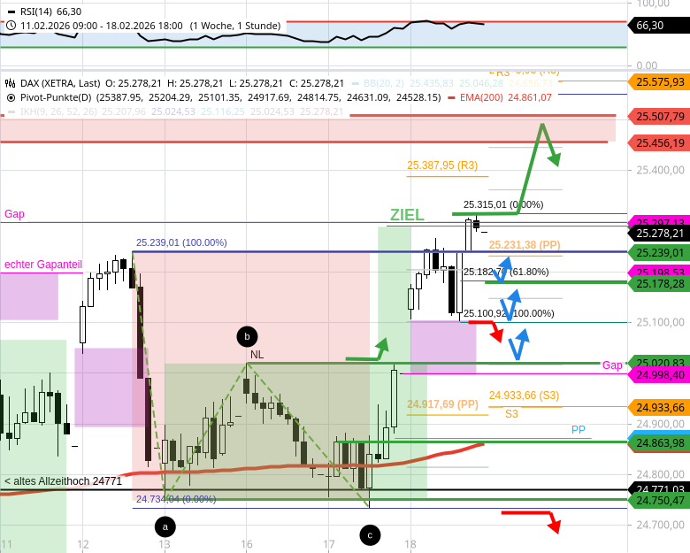 2) Pullbacks bis 25020 wären jedoch zulässig und sind demnach einzuplanen. Pullbacks zu 25020 haben heute speziell eine Chance, solange der DAX das gestrige Hoch 25315 noch nicht überbrücken kann.