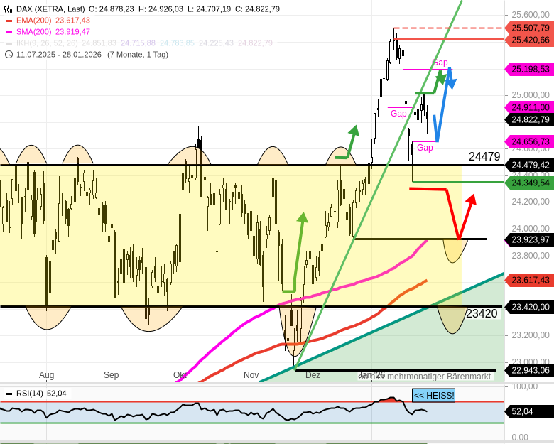 BULLE: Über 24950 schaltet der DAX in den Aufwärtsmodus für die Ziele 25000 und 25200.