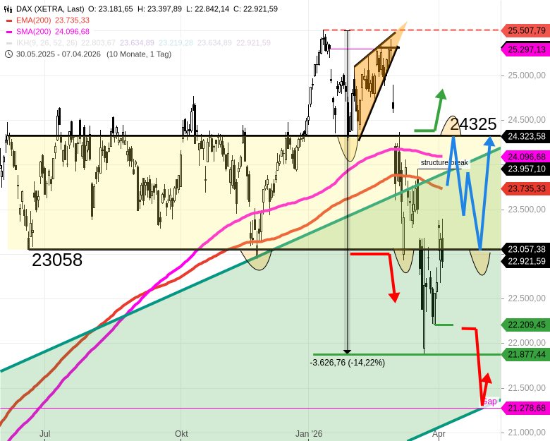 - 🔴 Fällt der DAX ab jetzt unter 22840, dann wäre die laufende Anstiegssequenz unterbrochen oder negiert. Dann fiele der DAX zu 21279.