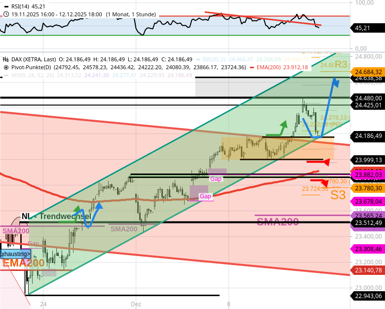 - Der DAX zeigte am Freitag den zulässigen Maximal-Pullback bis ca. 24200 (Horizontale 24186/24163 & alter roter Abwärtstrend vom Jahreshoch), nachdem zuvor ein oberes Zwischenziel (das erste Sommerhoch 2025) bei 24479 erreicht worden war.