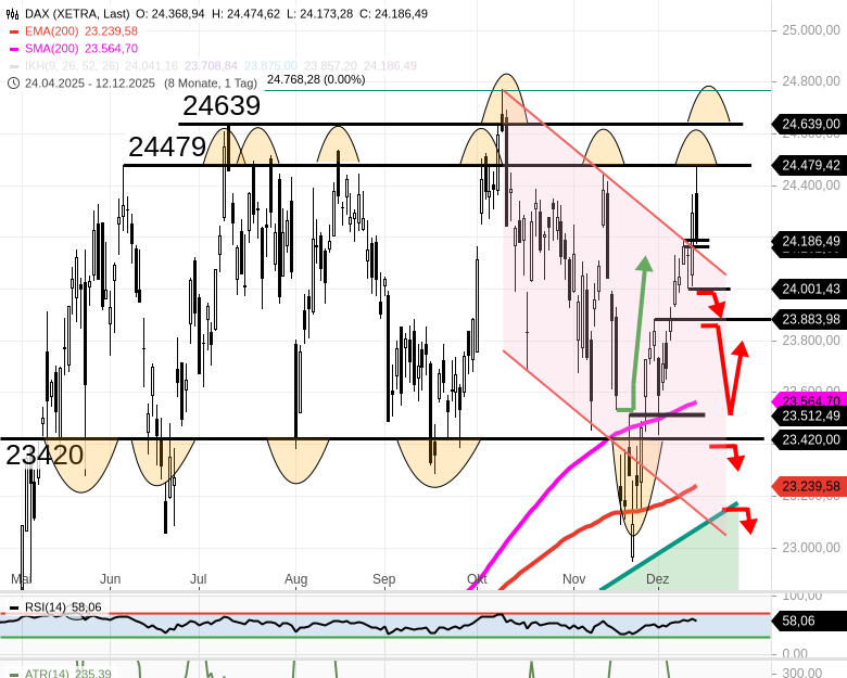 - DAX Fazit: Es bestehen noch Chancen auf das Eindringen in die Jahresendzielzone 24479/24639, solange der DAX nicht unter 24000, zumindest aber nicht unter 23565/23420 fällt.