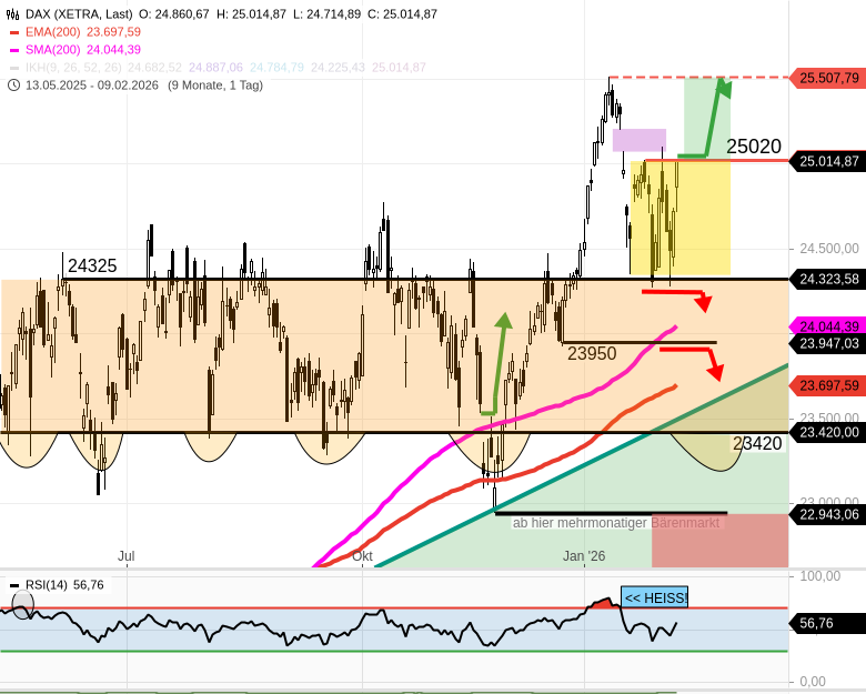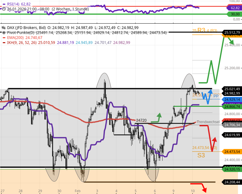 - Wenn die etablierte Range weiter Bestand hat, dann dreht der DAX bei 25020 um und fällt wieder Richtung der Gegenseite.