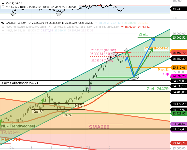 Ab 25400 dürfte ein 2. Pullbackabschnitt starten, zu 25233, 25120 und bis 20.1. im Idealfall auch zu 24890/24850. - Sollten die Marktteilnehmer zu gierig sein, dann könnten sie den DAX heute zwar bis 25510 und 25550 anheben, doch wäre dann schon wieder Schluss, da der Kanal den DAX Fortschritt momentan bei 25550 noch eindämmt. Daher lieber noch ein bisschen den DAX seitwärts laufen lassen. Je länger die Seitwärtsphase, desto größer das spätere Anstiegspotenzial.