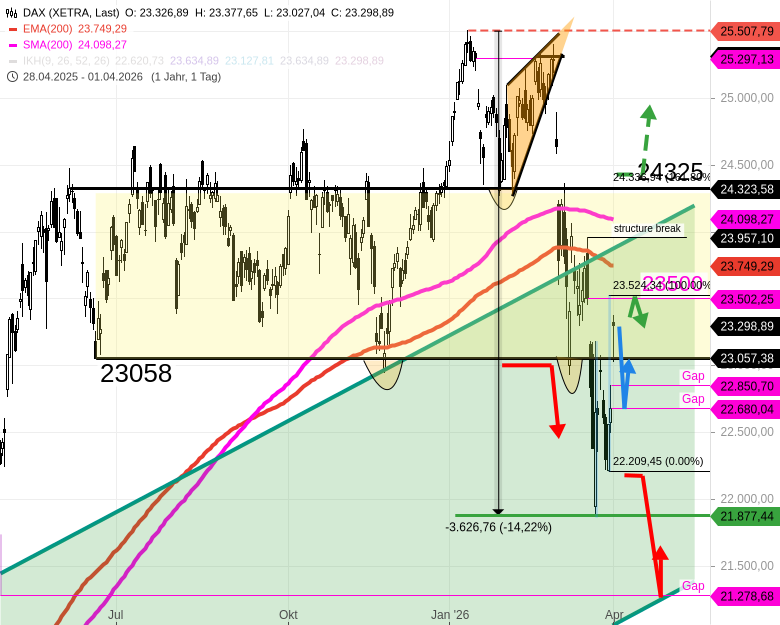 Unter 22600 und erst recht unter 22200 fällt der DAX zügig zu 21279/21100 (Gap Mai 25 und 4-jähriger Aufwärtstrend).
