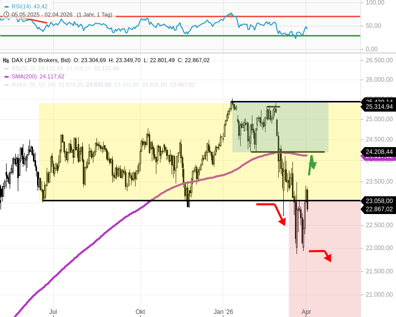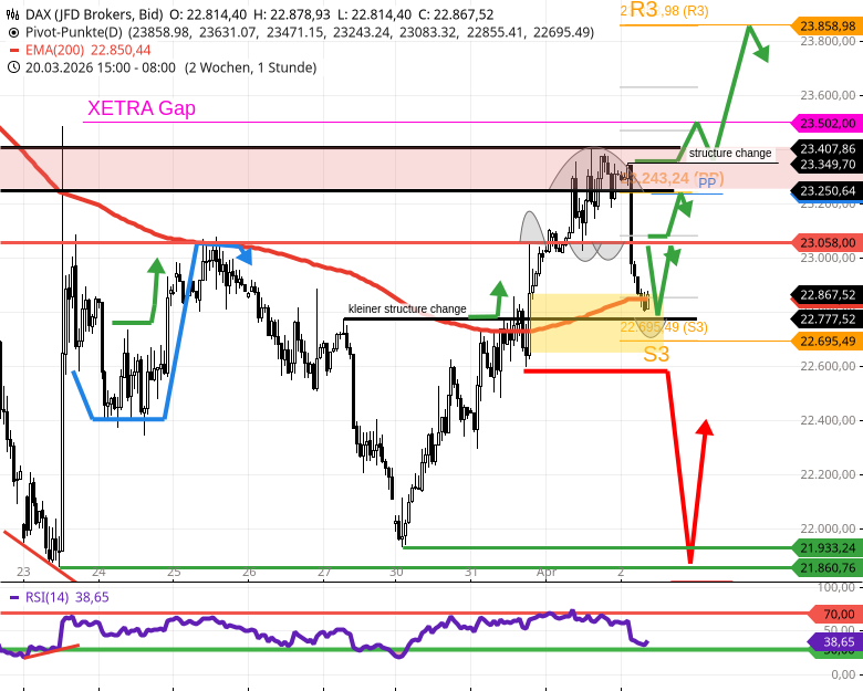 - 2) Der DAX fällt heute mindestens bis 22850 (echter Gapanteil) oder bis 22695/22680 und hat dann die Chance auf ein. weiteres "Aufbäumen" zu 23058 oder mehr.