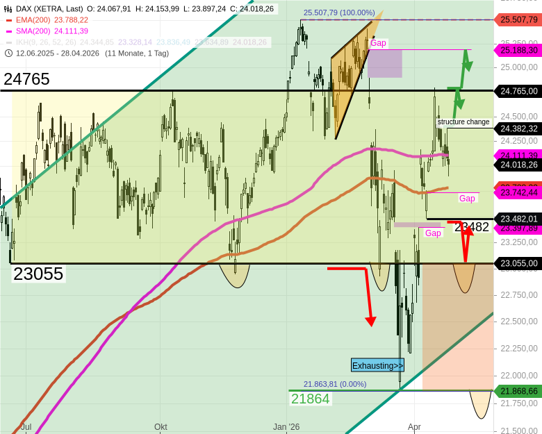 - Der DAX arbeitete gestern weiter an seinem Pullback vom "Blow-OFF"-Hoch des 17.4.26. Dabei erschienen neue 10-Tages-Tiefs bei ca. 23900.