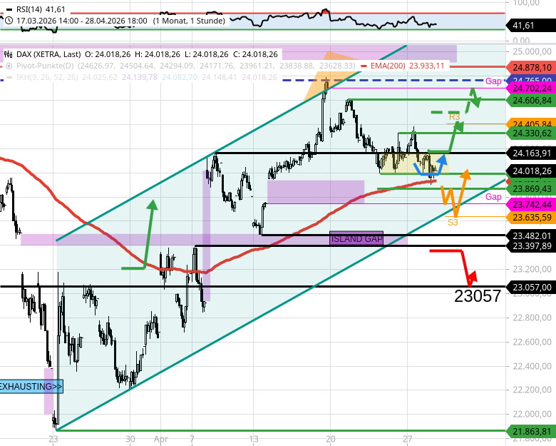 3) Fällt der DAX per Stundenschlusskurs 23933 (EMA200/h1), so weitet sich die Pullbackphase der letzten Tage weiter aus bis 23788 (EMA200/d) sowie zu 23742 (Gap) oder bis 23635 (Aufwärtstrend vom Jahrestief und zugleich die Lage des heutigen Pivot S3, XETRA).