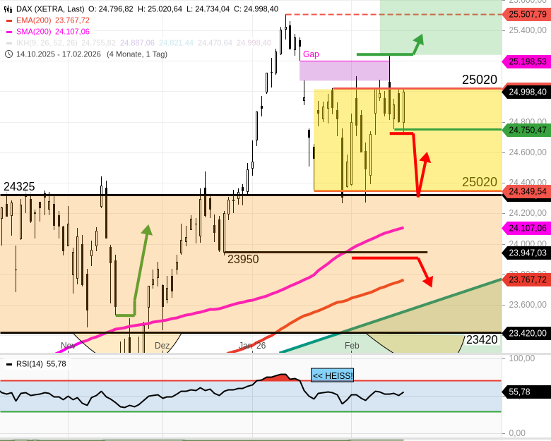 - 1) Bleibt der DAX ab 9 Uhr im Haupthandel unter 25020, wäre zunächst ein Rücklauf bis 24925 oder 24880/24877 zu unterstellen. Beides sind Unterstützungen.