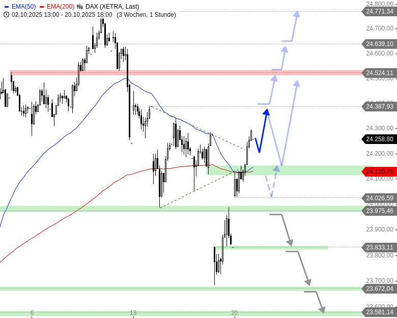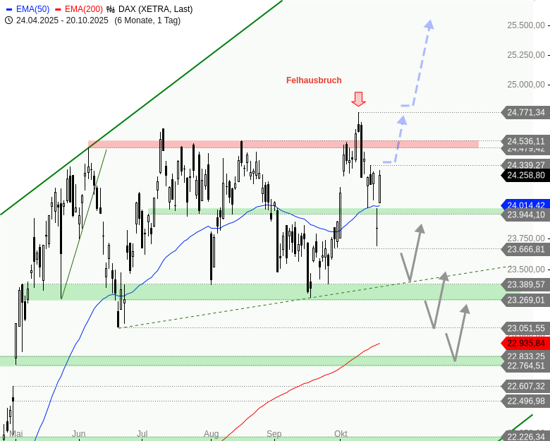 - Die Vorgabe könnte nicht besser sein. Die Chancen auf der Oberseite sind wieder deutlich erhöht, wobei kurzfristig auch Zwischenkorrekturen auf erhöhtem Niveau denkbar wären. Bei 24.220 und 24.130 - 24.150 liegen jetzt Auffangzonen, ein sehr tiefer Pullback zum gestrigen Tagestief wäre momentan nur ein Alternativszenario.