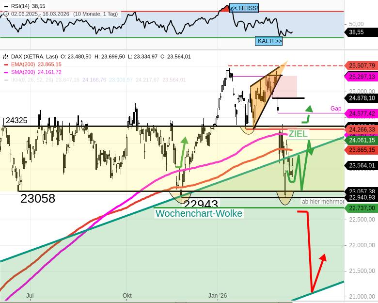 - 🔴 7) Bricht der DAX mit eine langen schwarzen Momentum-Stundenkerze unter 23300/23250 ein, so wäre eine Route 23050/23010 oder 22945/22900 bestätigt, was aber nicht das Ende der Chance für ein späteres DAX Anlaufen zu 24100 wäre.
