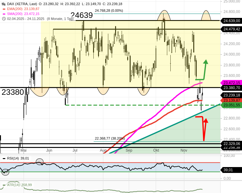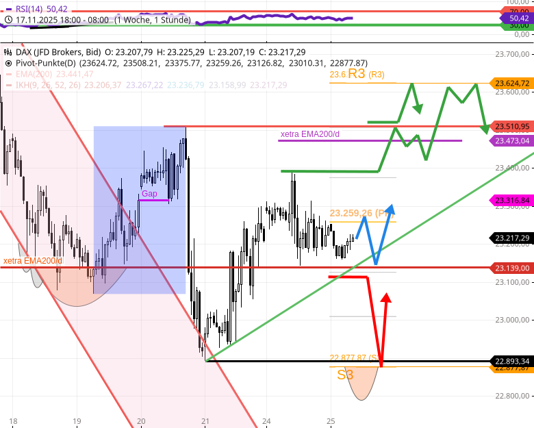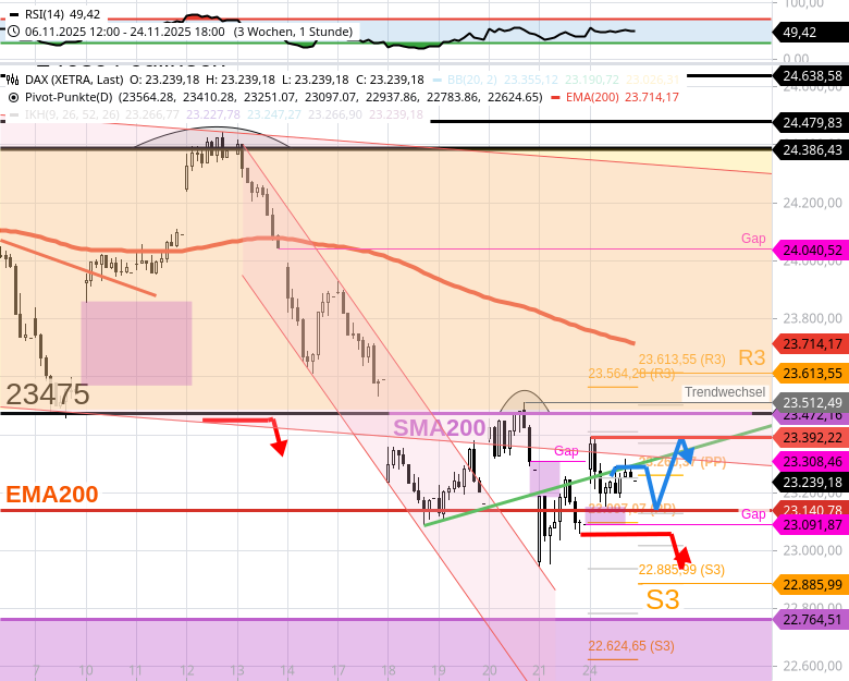 - 🔴BÄRISCH: Ein DAX Rückfall unter 23140 (EMA200/ Tageskerzenchart) könnte den DAX bis 23000 und heute maximal bis 22890/222875 nachgeben lassen.