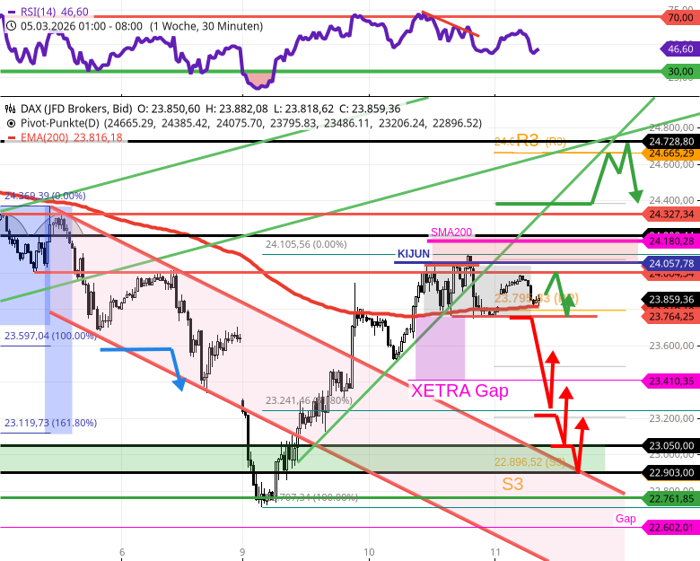- XETRA DAX 23560 (S3) sowie 23410 (Gap) und 23380 (horizontal)