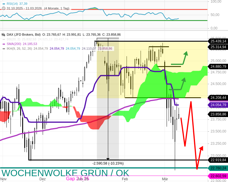 - Wenn wir von einem belastbaren Tief an einer extrem wichtigen Nackenlinie 22943 ausgehen, dann hat der DAX vorerst einigen Spielraum, sich oberhalb von 22943 zu bewegen.